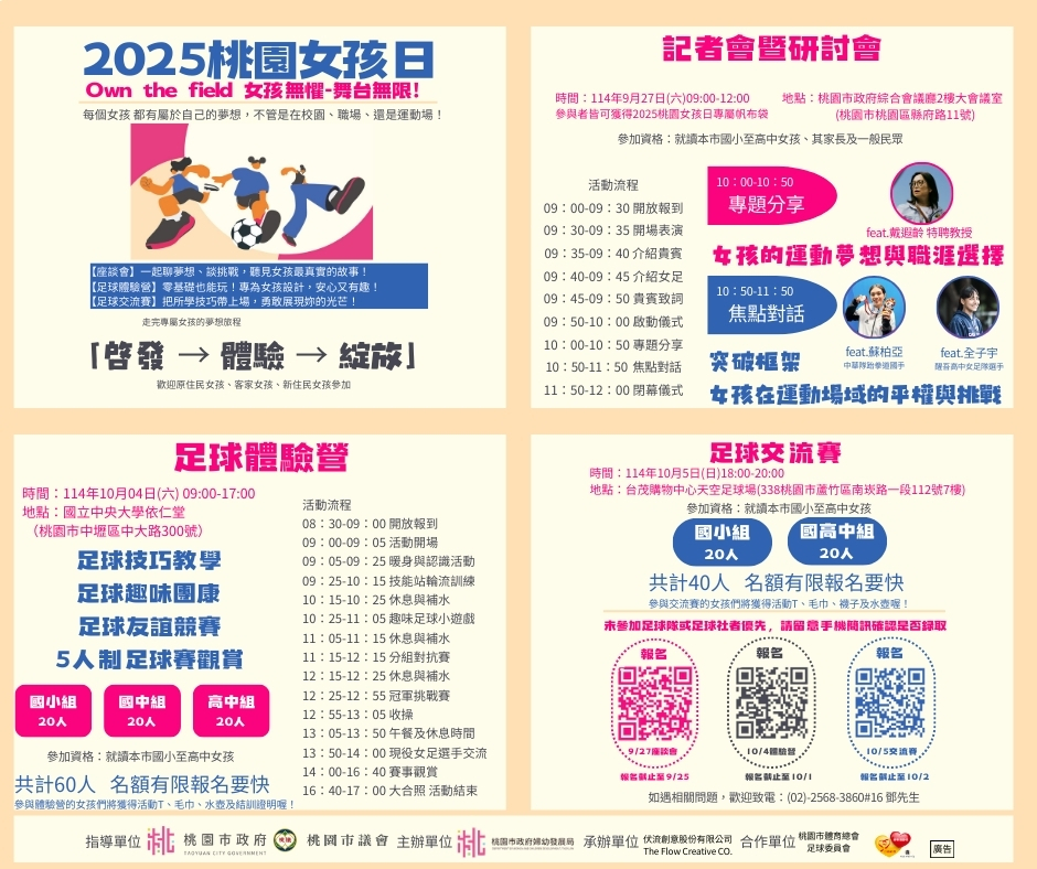 一、 | 為響應聯合國訂定 10 月 11 日為「女孩日」重視女孩投資與培力精神,今(114)年本局將延續深受好評的「運動性別平權」主軸,鼓勵嘗試更多元的運動項目,強化社會對女孩培力之認識與支持,並促進其健康發展與自信展現,辦理活動如下: |
