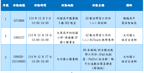| 1、 | 活動編號: 5274806 、 5360127 ,活動名稱: A2 數位學習工作坊(二)-因材網、 A2 數位學習工作坊(二)-HiTeach 教學應用,請至「全國教師在職進修資訊網」(https://www2.inservice.edu.tw/)報名。 |