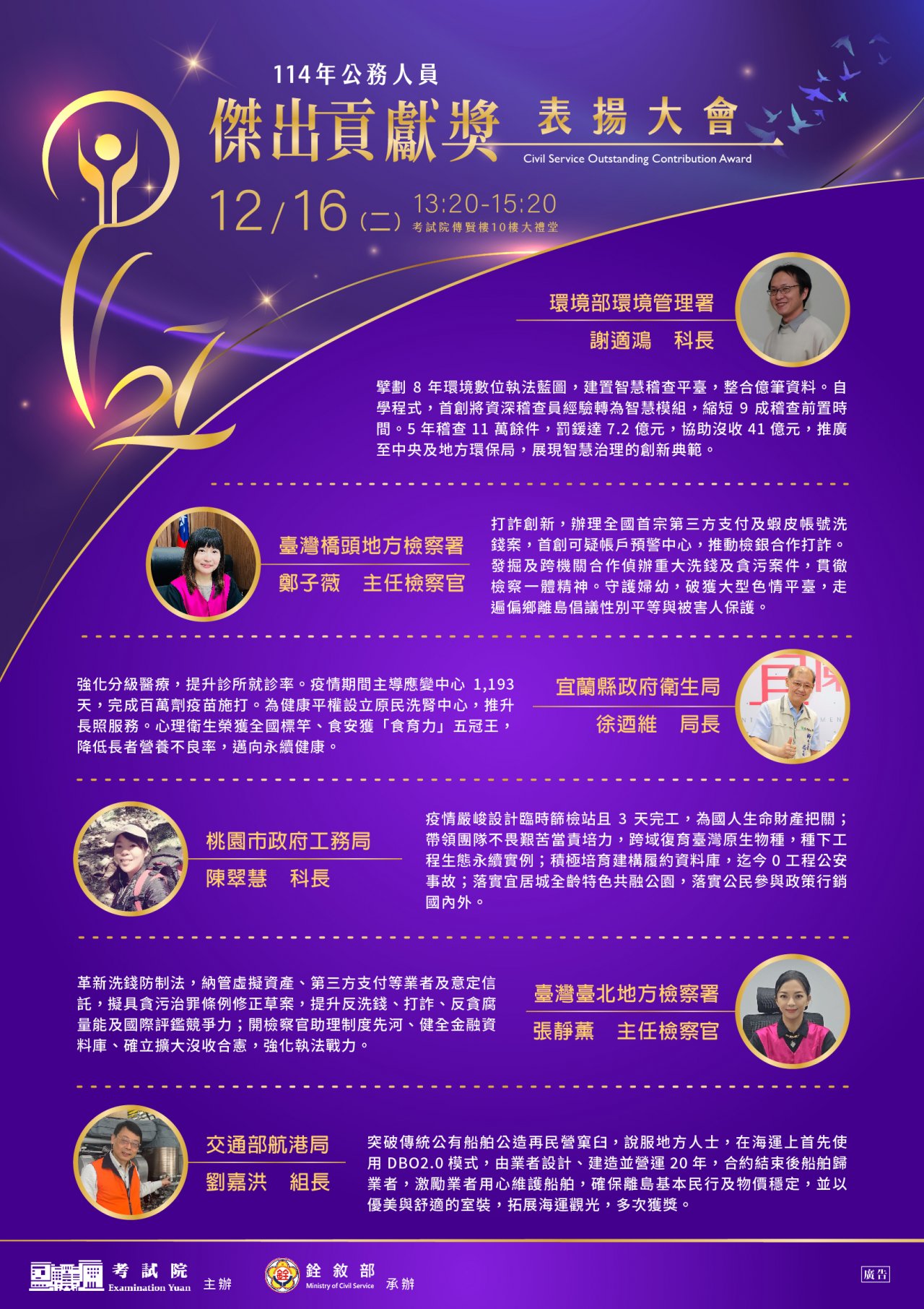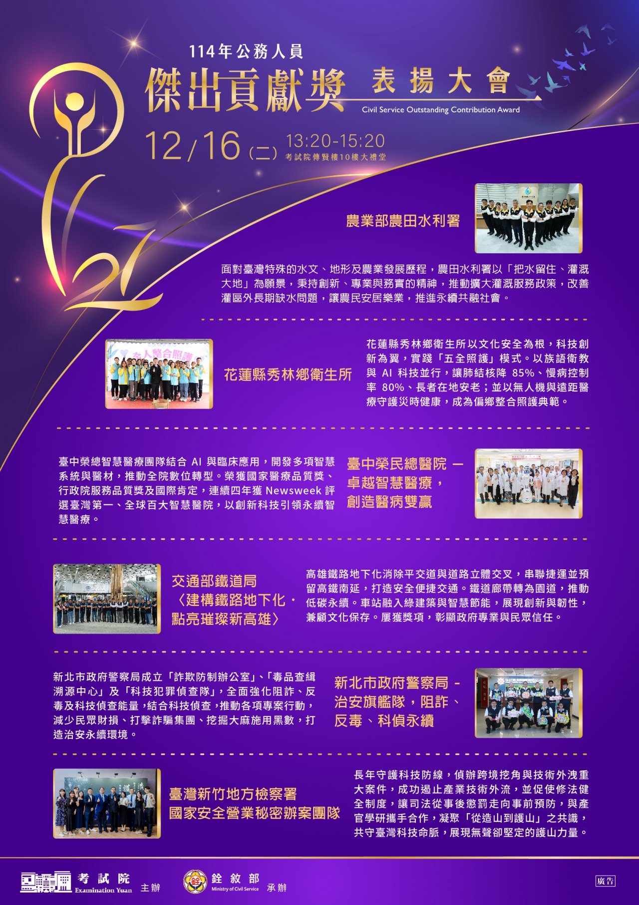 主旨: 有關「114 年公務人員傑出貢獻獎表揚大會」電子海報,請查照並協助公告。