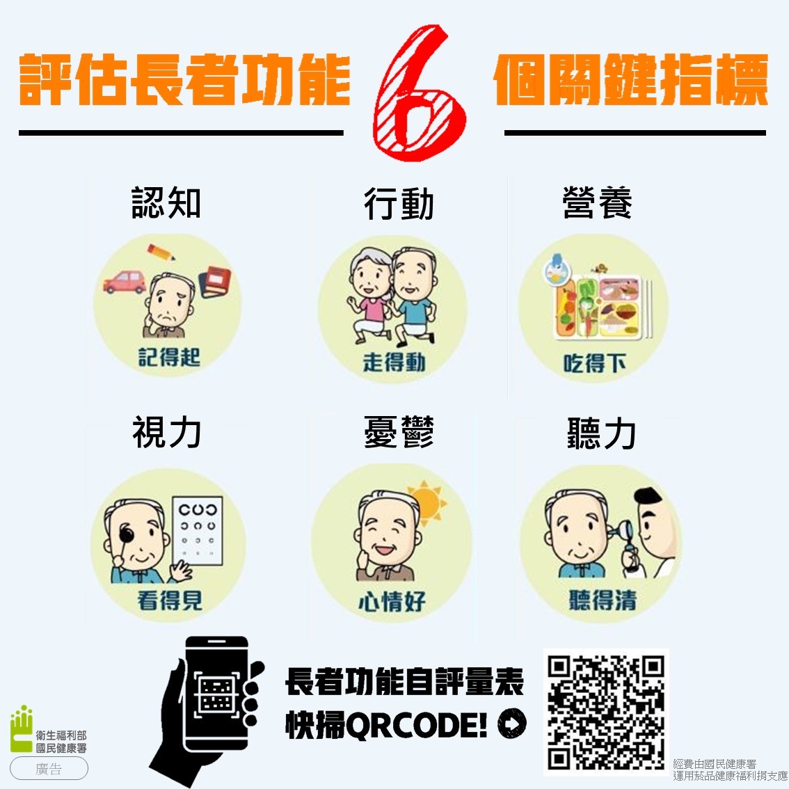 二、因應國內人口結構快速高齡化及長者常併有慢性疾病,可能導致長者身體出現失能、失智等健康問題,造成國內長照體系沉重負擔,爰國健署參酌世界衛生組織( WHO )長者整合性照護評估指引( ICOPE ),規劃教育 65 歲以上長者(原住民為 55 歲以上)及長者家屬認識並操作長者功能自評量表,透過旨揭 LINE@針對 6 大面向(認知、行動、視力、聽力、營養及憂鬱)作評估,完成前開評估,系統將自動提供健康資訊或資源地圖,以利後續資源連結,及長者自我健康管理。